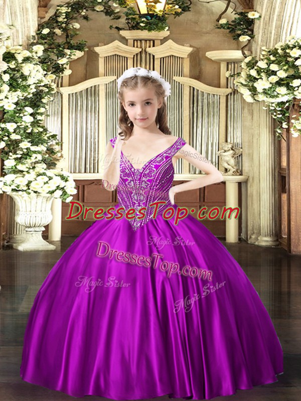 New Arrival Purple Sleeveless Floor Length Beading Lace Up Pageant Dress for Girls