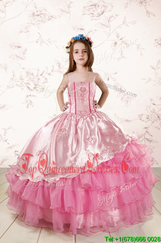 New Arrival Rose Pink Sleeveless Floor Length Embroidery and Ruffled Layers Lace Up Child Pageant Dress