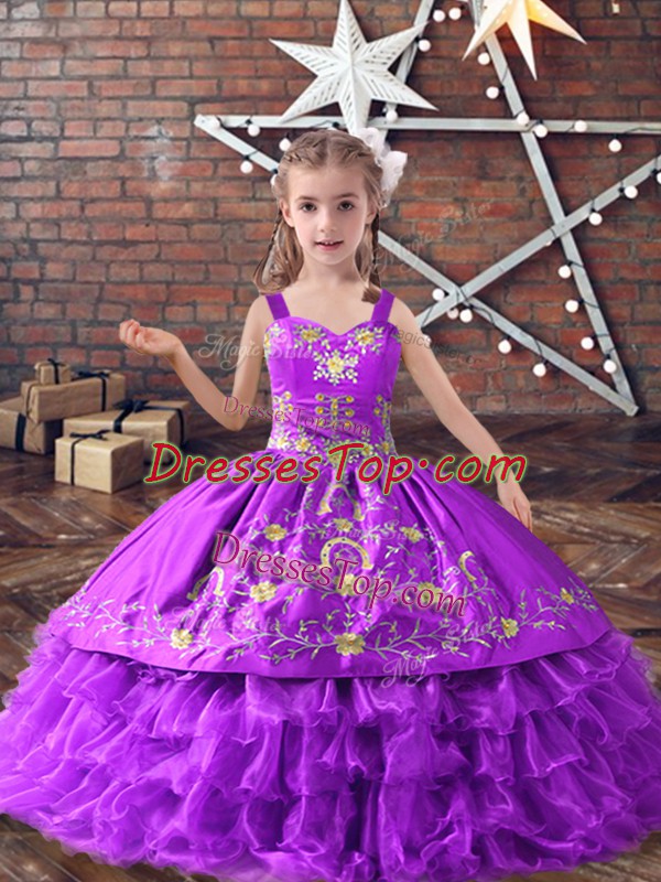 New Arrival Satin and Organza Straps Sleeveless Lace Up Embroidery and Ruffled Layers Little Girls Pageant Gowns in Lavender