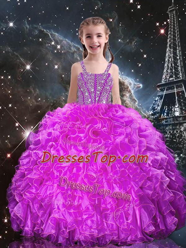 New Style Beading and Ruffles Girls Pageant Dresses Fuchsia Lace Up Sleeveless Floor Length