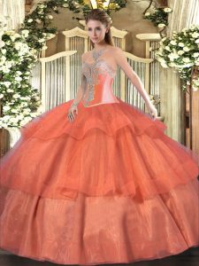 New Style Coral Red Ball Gowns Tulle Sweetheart Sleeveless Beading and Ruffled Layers Floor Length Lace Up 15 Quinceanera Dress