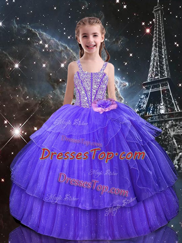 New Style Eggplant Purple Ball Gowns Organza Straps Sleeveless Beading and Ruffled Layers Floor Length Lace Up Little Girls Pageant Gowns