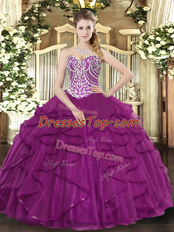 New Style Fuchsia Sweetheart Lace Up Beading and Ruffles Quinceanera Gowns Sleeveless