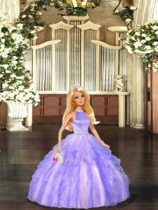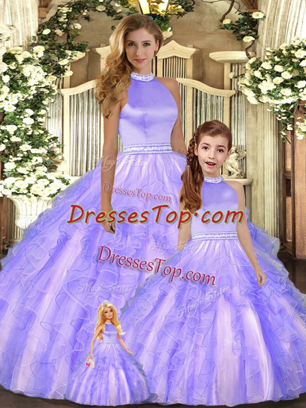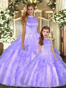 New Style Lavender Ball Gowns Halter Top Sleeveless Tulle Floor Length Backless Beading and Ruffles Quince Ball Gowns