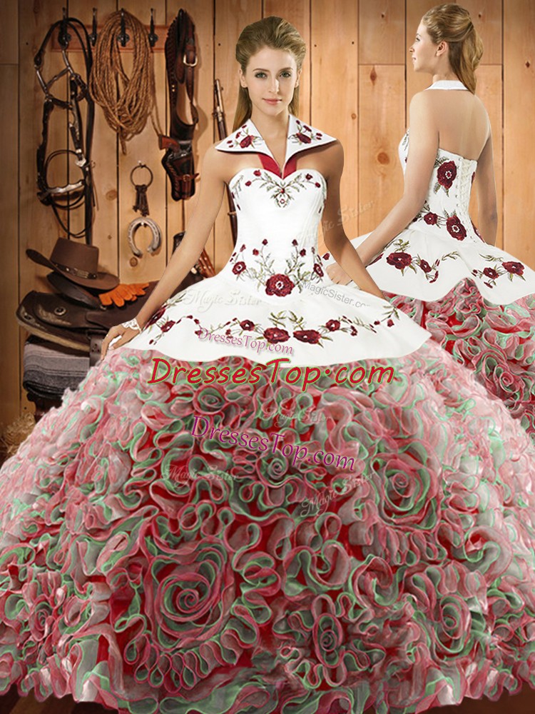 New Style Multi-color Ball Gowns Fabric With Rolling Flowers Halter Top Sleeveless Embroidery Lace Up Sweet 16 Dresses Sweep Train