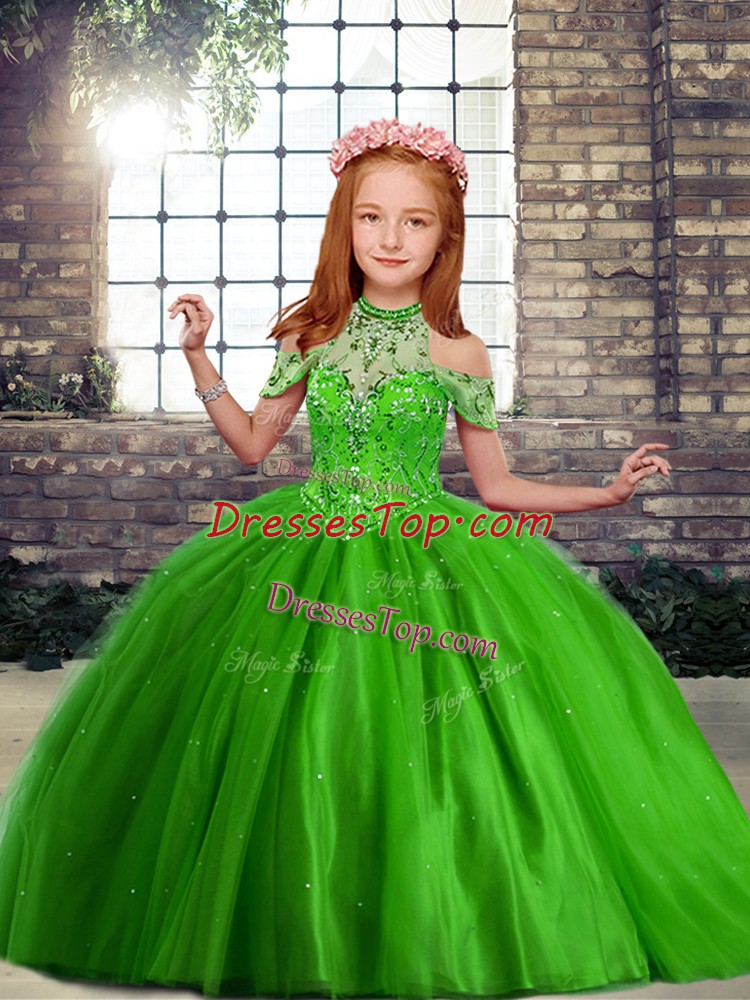 New Style Off The Shoulder Sleeveless Kids Pageant Dress Floor Length Beading Green Tulle