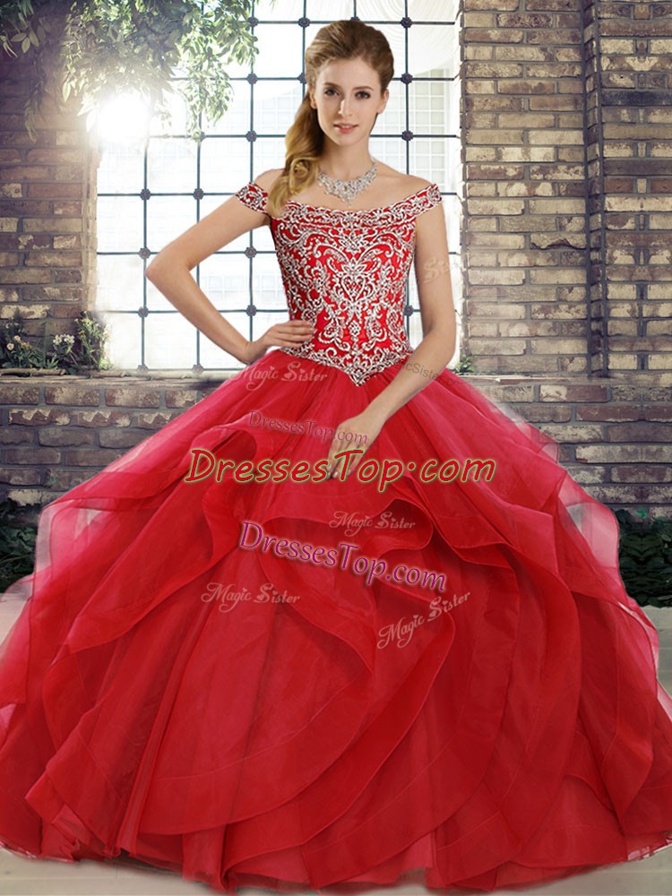 New Style Red Sleeveless Tulle Brush Train Lace Up Quinceanera Dress for Military Ball and Sweet 16 and Quinceanera