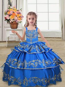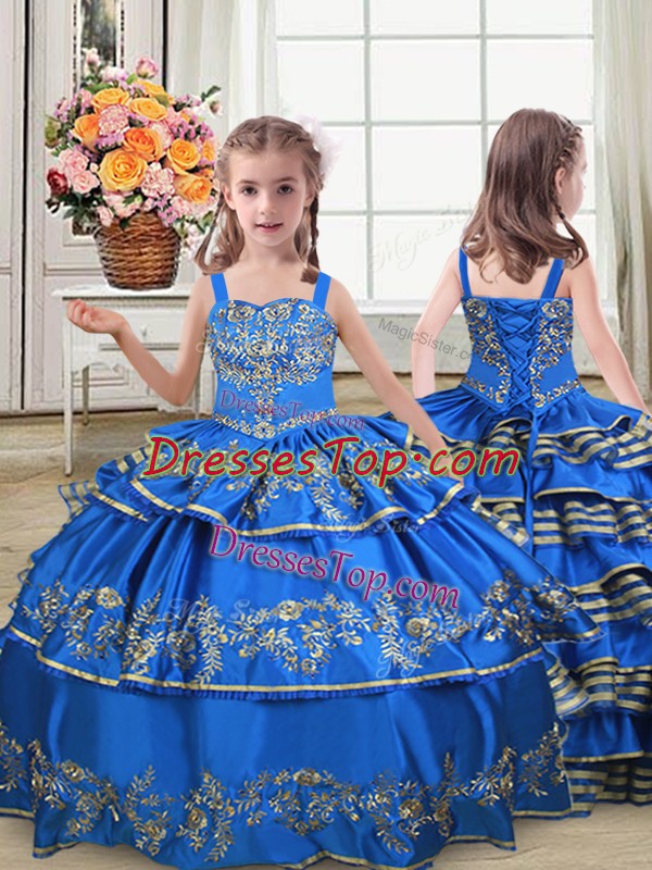 New Style Royal Blue Ball Gowns Satin Straps Sleeveless Embroidery and Ruffled Layers Floor Length Lace Up Kids Pageant Dress