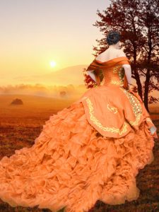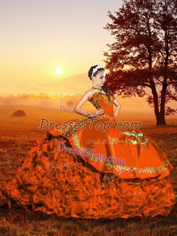 New Style Rust Red Ball Gown Prom Dress Military Ball and Sweet 16 and Quinceanera with Embroidery and Ruffles Sweetheart Sleeveless Brush Train Lace Up