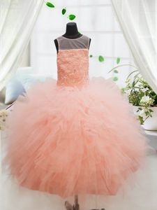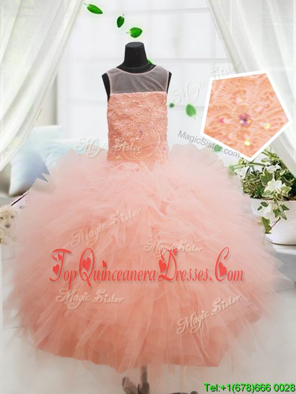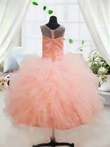 New Style Scoop Sleeveless Zipper Little Girls Pageant Dress Wholesale Peach Tulle
