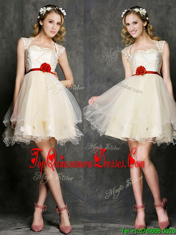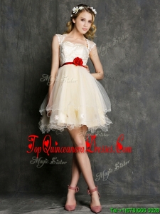 New Style Straps Short Quinceanera Dama Dress with Belt and Appliques