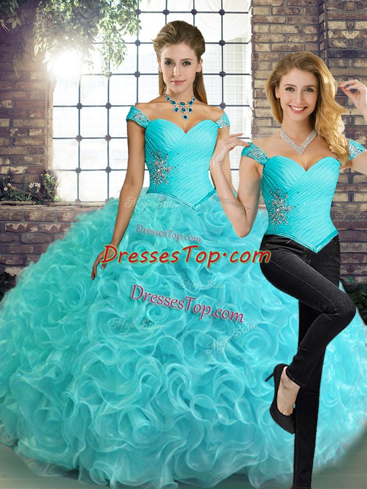 New Style Two Pieces Quinceanera Dresses Aqua Blue Off The Shoulder Fabric With Rolling Flowers Sleeveless Floor Length Lace Up