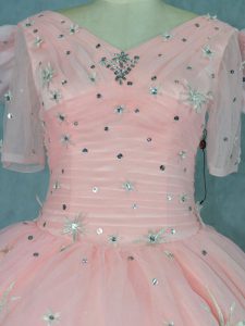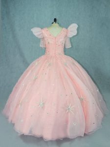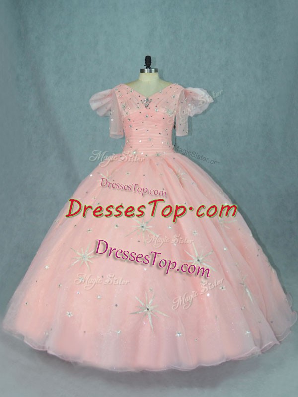 New Style V-neck Short Sleeves Organza Sweet 16 Dress Beading Zipper