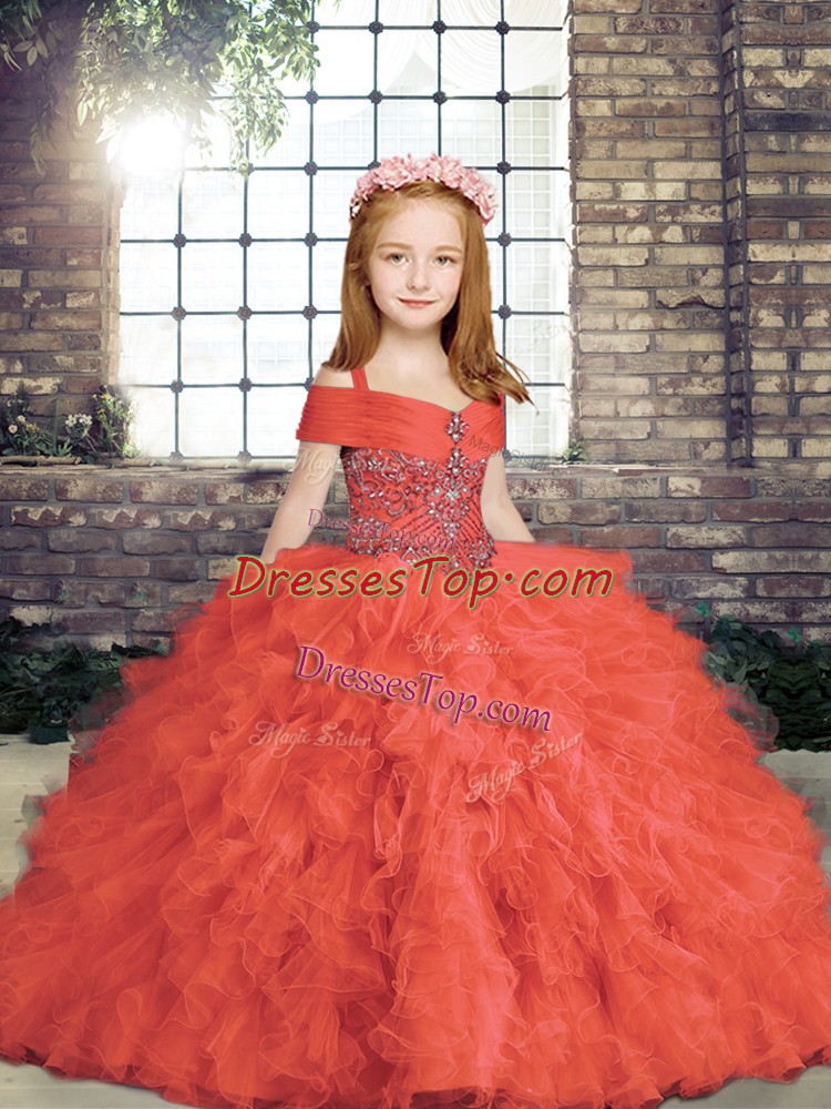Nice Ball Gowns Girls Pageant Dresses Red Straps Tulle Sleeveless Floor Length Lace Up