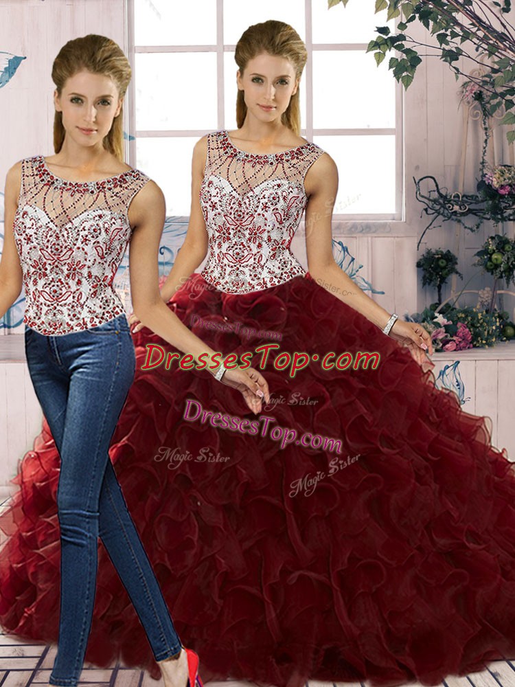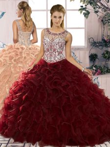 Nice Burgundy Quince Ball Gowns Military Ball and Sweet 16 and Quinceanera with Beading and Ruffles Scoop Sleeveless Lace Up