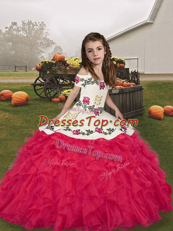 Nice Coral Red Lace Up Straps Embroidery and Ruffles Little Girls Pageant Dress Organza Sleeveless