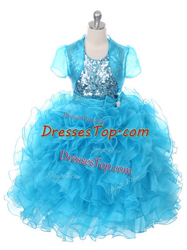 Nice Floor Length Lace Up Little Girl Pageant Dress Baby Blue for Wedding Party with Ruffles and Sequins and Bowknot