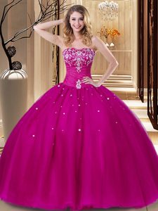 Nice Fuchsia Tulle Lace Up Sweetheart Sleeveless Floor Length Quinceanera Gown Beading and Embroidery