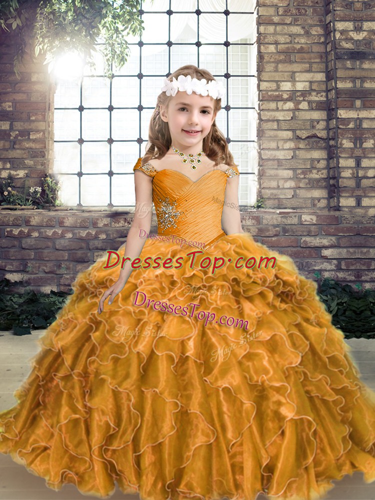 Nice Gold Ball Gowns Beading and Ruffles Kids Formal Wear Lace Up Organza Sleeveless Floor Length