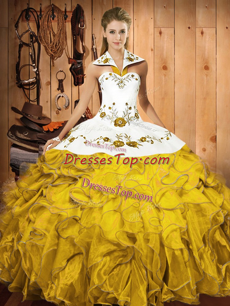 Nice Gold Ball Gowns Satin and Organza Halter Top Sleeveless Embroidery and Ruffles Floor Length Lace Up Sweet 16 Quinceanera Dress