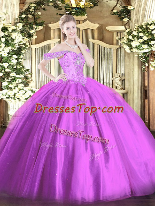 Nice Lilac Tulle Lace Up Off The Shoulder Sleeveless Floor Length Quinceanera Dresses Beading