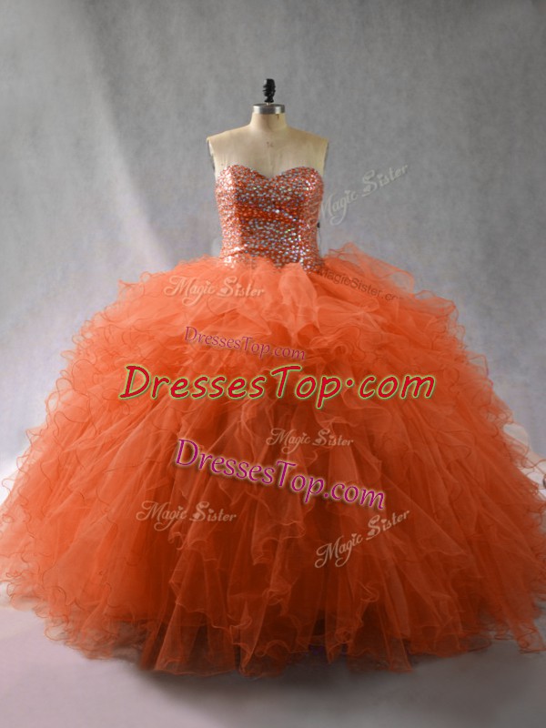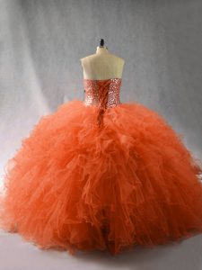 Nice Orange Red Ball Gowns Sweetheart Sleeveless Tulle Floor Length Lace Up Beading and Ruffles 15th Birthday Dress
