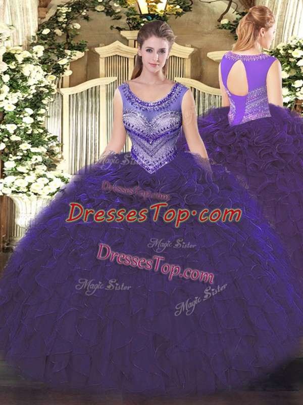 Nice Purple Ball Gowns Organza Scoop Sleeveless Beading and Ruffles Floor Length Lace Up Quinceanera Dresses