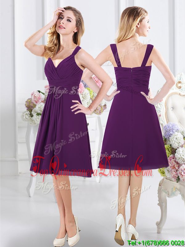 Nice Purple Zipper Court Dresses for Sweet 16 Ruching Sleeveless Knee Length