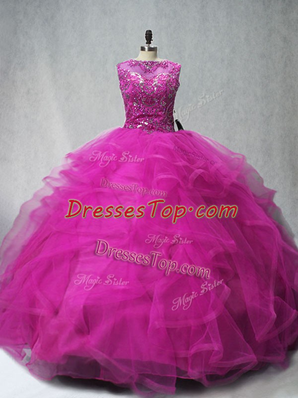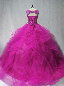 Nice Scoop Sleeveless 15th Birthday Dress Brush Train Beading and Ruffles Fuchsia Tulle