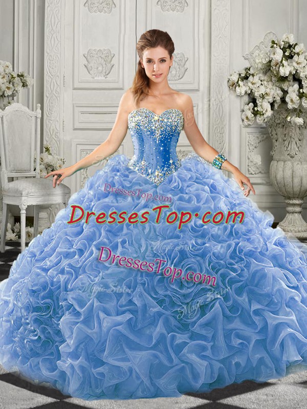 Nice Sleeveless Beading and Ruffles Lace Up Quinceanera Dresses with Light Blue Court Train