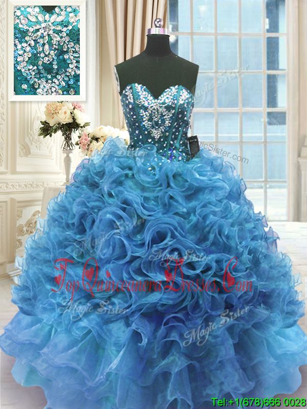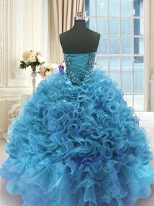 Nice Sleeveless Organza Floor Length Lace Up Sweet 16 Dress in Blue for with Beading