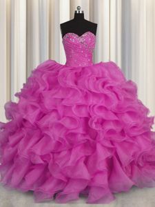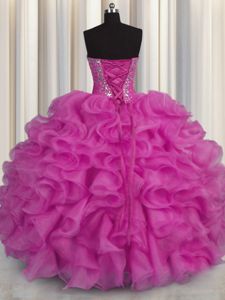 Nice Sleeveless Organza Floor Length Lace Up Vestidos de Damas in Fuchsia for with Beading and Ruffles