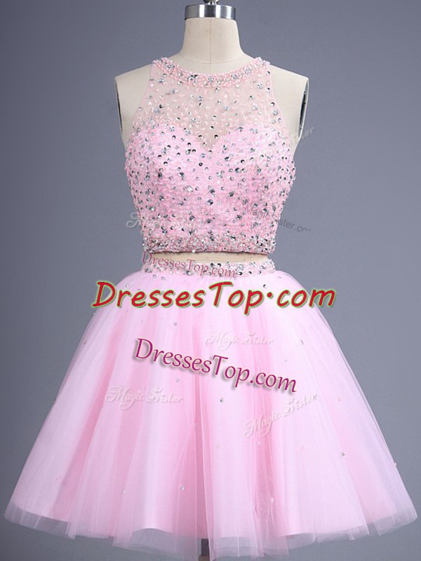 Nice Sleeveless Tulle Knee Length Lace Up Damas Dress in Rose Pink with Beading