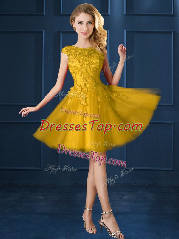Noble A-line Dama Dress Gold Bateau Tulle Cap Sleeves Knee Length Lace Up
