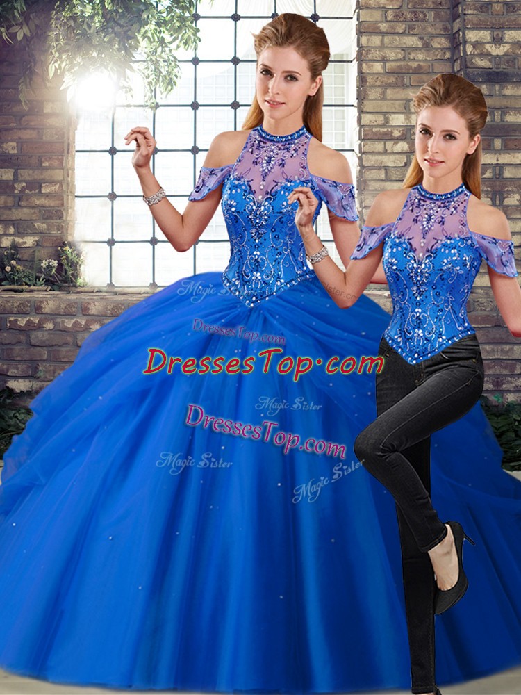 Noble Blue 15th Birthday Dress Halter Top Sleeveless Brush Train Lace Up