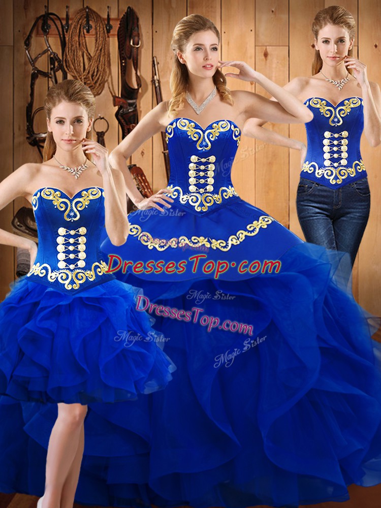 Noble Blue Ball Gowns Satin and Organza Sweetheart Sleeveless Embroidery and Ruffles Floor Length Lace Up Sweet 16 Dresses