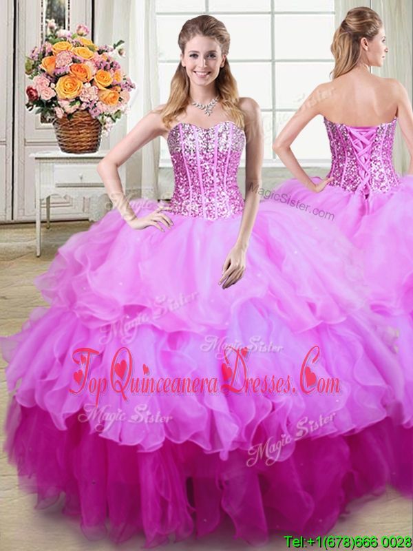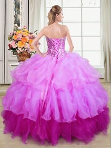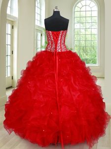 Noble Four Piece Sweetheart Sleeveless Quince Ball Gowns Floor Length Beading and Ruffles Red Organza