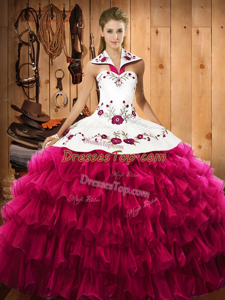 Noble Fuchsia Sleeveless Floor Length Embroidery and Ruffled Layers Lace Up Quince Ball Gowns