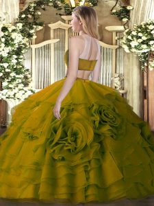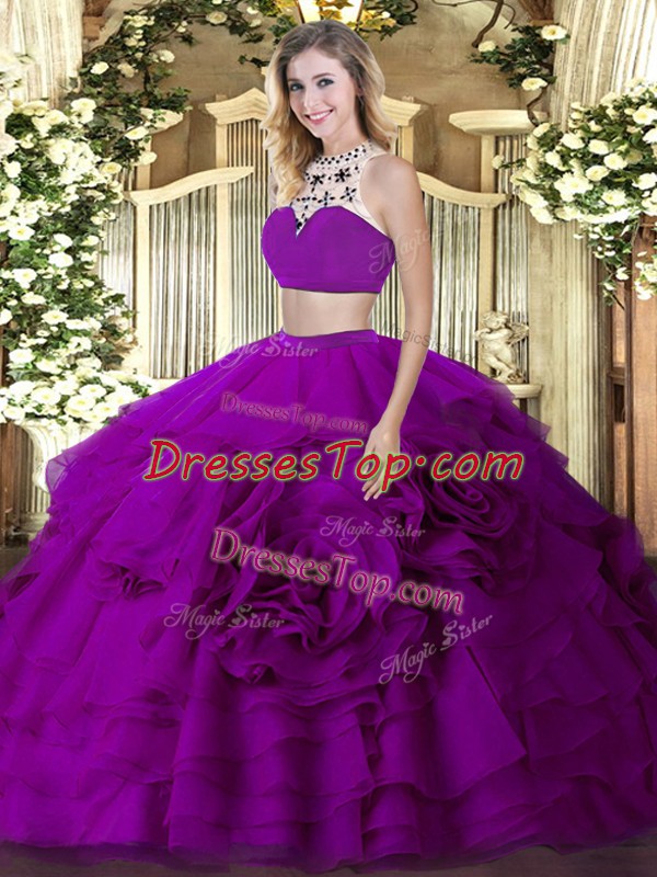 Noble High-neck Sleeveless Quinceanera Dresses Floor Length Beading and Ruffled Layers Fuchsia Tulle