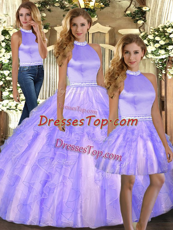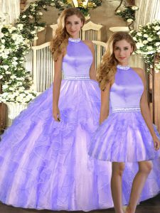Noble Lavender Tulle Backless Halter Top Sleeveless Floor Length Sweet 16 Dress Beading and Ruffles