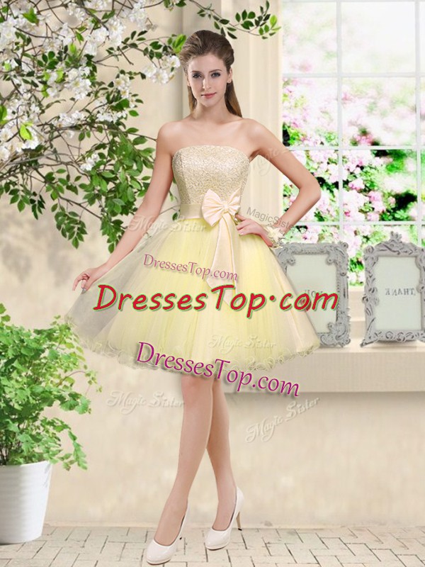Noble Light Yellow Organza Lace Up Off The Shoulder Sleeveless Knee Length Quinceanera Court Dresses Lace and Belt