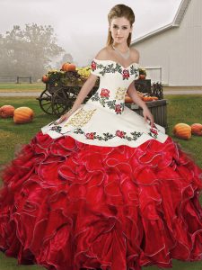 Noble Off The Shoulder Sleeveless Lace Up Quinceanera Gowns White And Red Organza