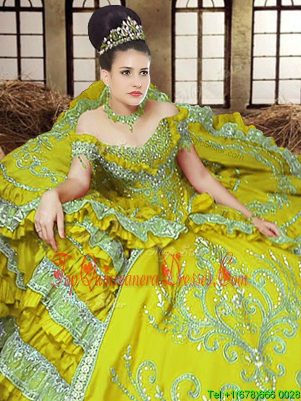 Off the Shoulder Floor Length Lace Up Ball Gown Prom Dress Light Yellow and In for Military Ball and Sweet 16 and Quinceanera with Embroidery