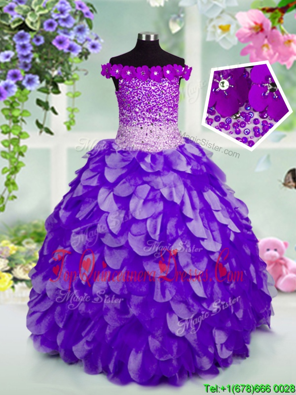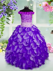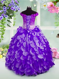 Off the Shoulder Floor Length Navy Blue Pageant Dress Womens Organza Sleeveless Beading and Hand Made Flower