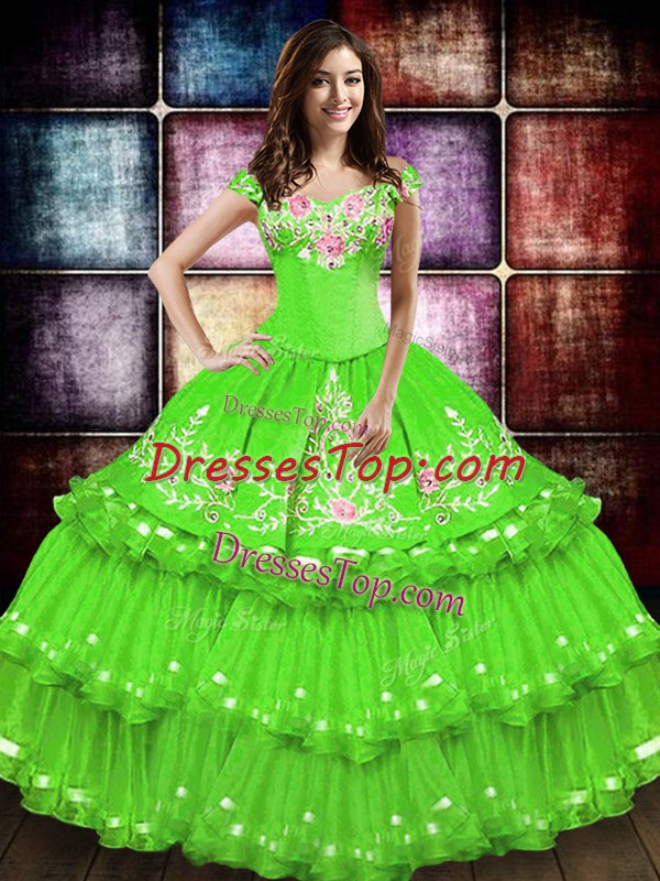 Off The Shoulder Neckline Embroidery and Ruffled Layers Quinceanera Gowns Sleeveless Lace Up