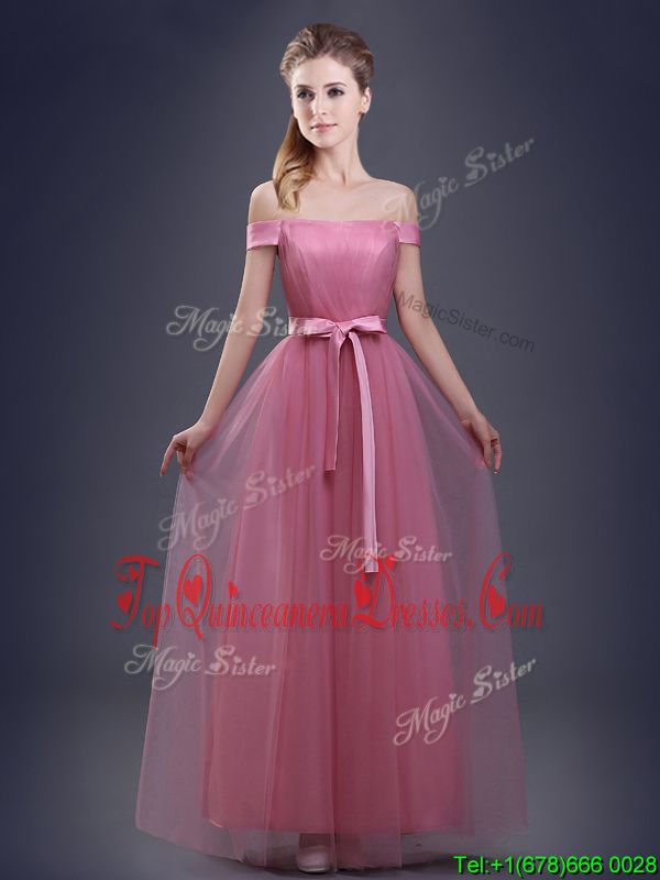 Off the Shoulder Pink Empire Ruching and Bowknot Dama Dress for Quinceanera Lace Up Tulle Sleeveless Floor Length