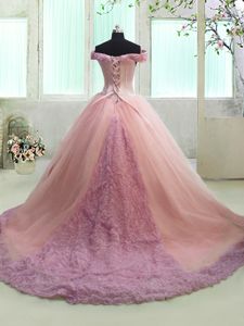 Off the Shoulder Pink Organza Lace Up Quinceanera Dama Dress Short Sleeves With Train Court Train Hand Made Flower