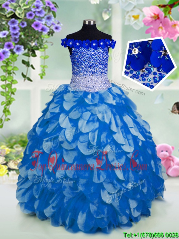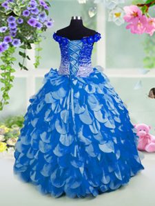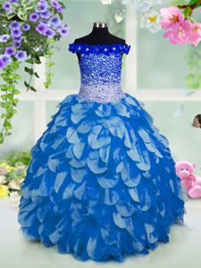 Off the Shoulder Sequins Blue Short Sleeves Organza Lace Up Winning Pageant Gowns for Party and Wedding Party