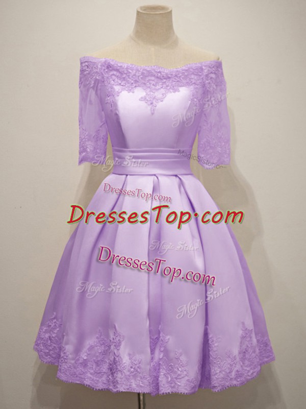 Off The Shoulder Short Sleeves Dama Dress for Quinceanera Knee Length Lace Lavender Taffeta