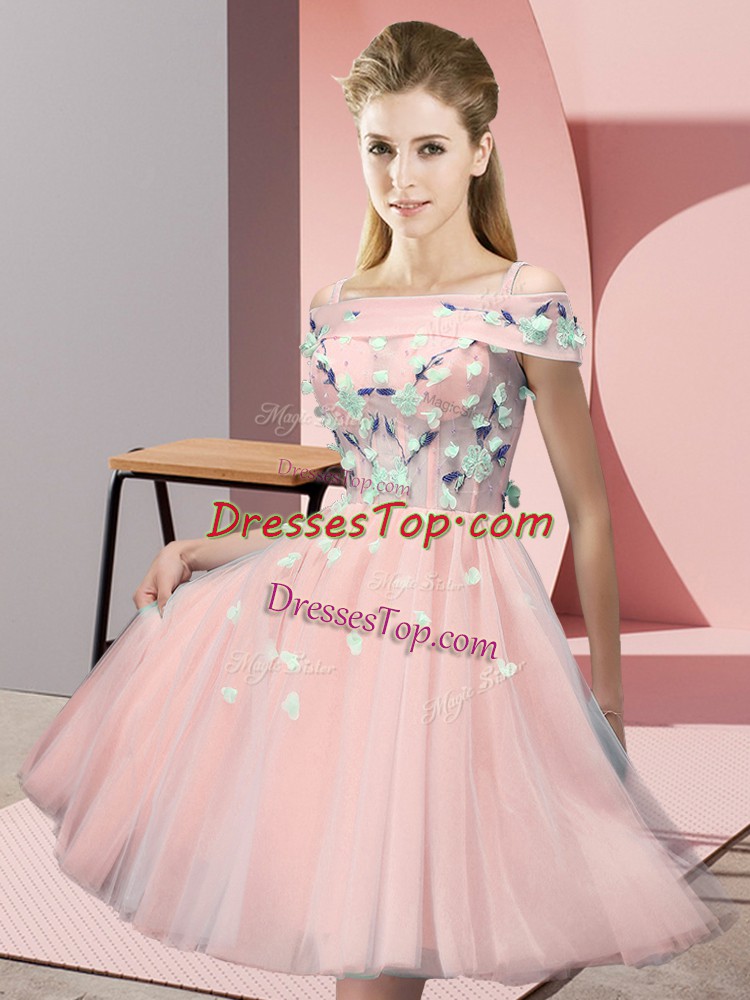Off The Shoulder Short Sleeves Lace Up Dama Dress for Quinceanera Pink Tulle